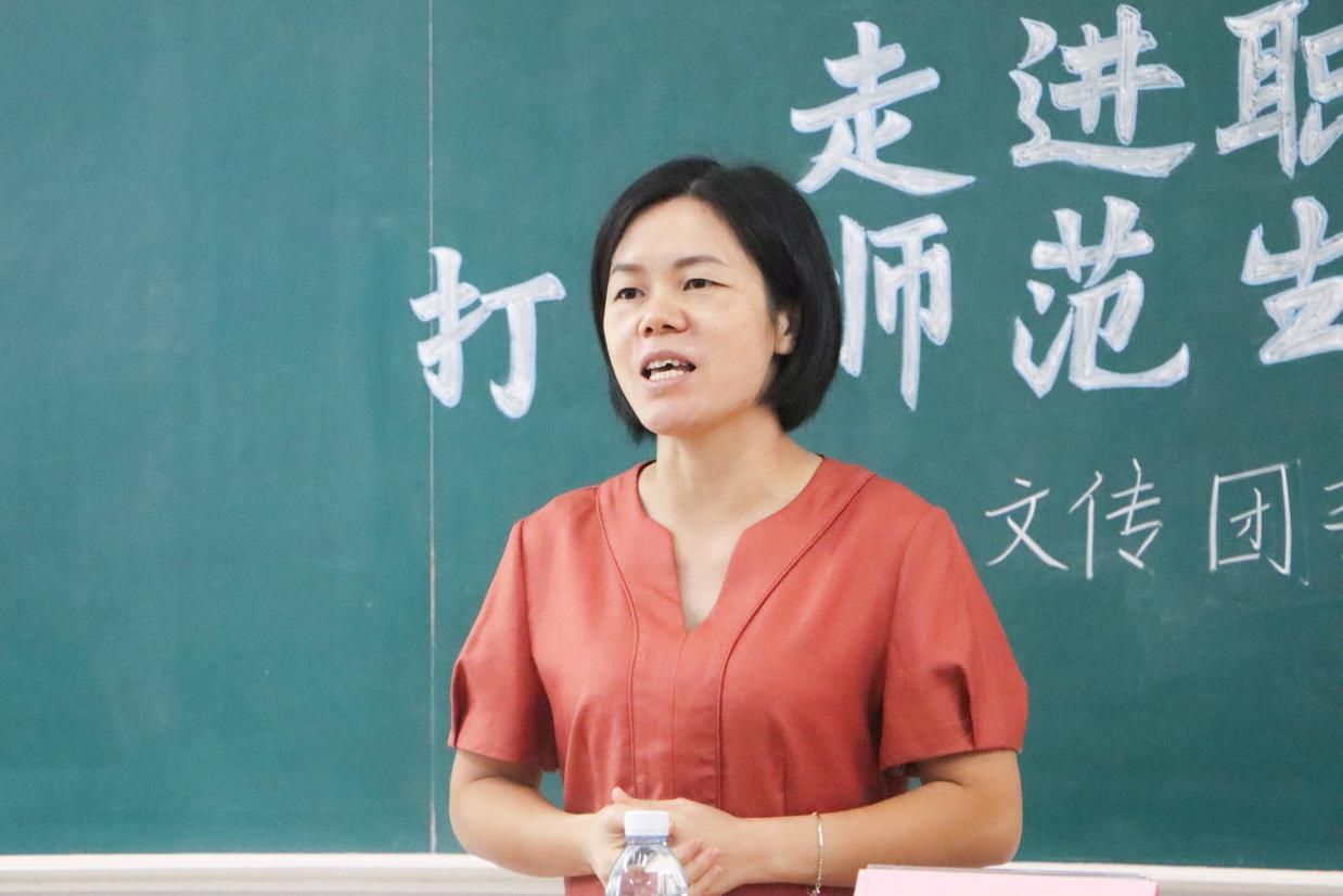彭冰先是利用湛江机电学校的招生宣传视频,让同学们感受新时代职业教育发展的现状与内涵,了解职业教育“德技双馨,立德树人”的教育目标,也感受到了职业教育“走进春天”的现状。她还借助相关政策和职业教育发展的需要向同学们讲解了职业教育中文化课的设置,也充分展示了职业教育对于文化课老师的需求,让同学们对自己就业方向有了新的思考。她希望我们打破对职业教育的传统“学而优则仕”的偏见,更加全面地了解新时代职业教育发展的现状和内涵。