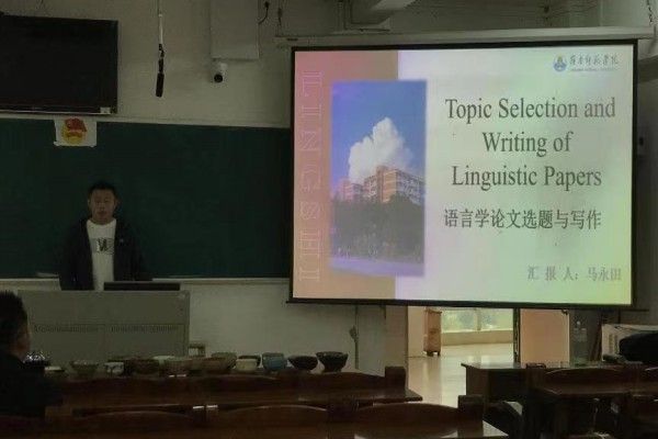 会上,马永田首先讲述科研与教学的关系,他表示,教学是立身之本,科研是安身之道,两者相辅相成,缺一不可。接着,马永田从“小、新、深、顺”四个方面系统地阐释语言学论文的选题与写作。他强调,学术研究最基本又最重要的是有能发现问题的眼光或提出问题的能力。提问的能力主要依赖于学养,学养越深厚,越能在别人看不出问题的地方发现问题。随后,马永田在关于语言学论文的选题与写作方面上提出“一二三”法则,即一个点、两种思维和三种创新。他表示,发散思维和分析思维在语言学论文的选题与写作中尤为重要。