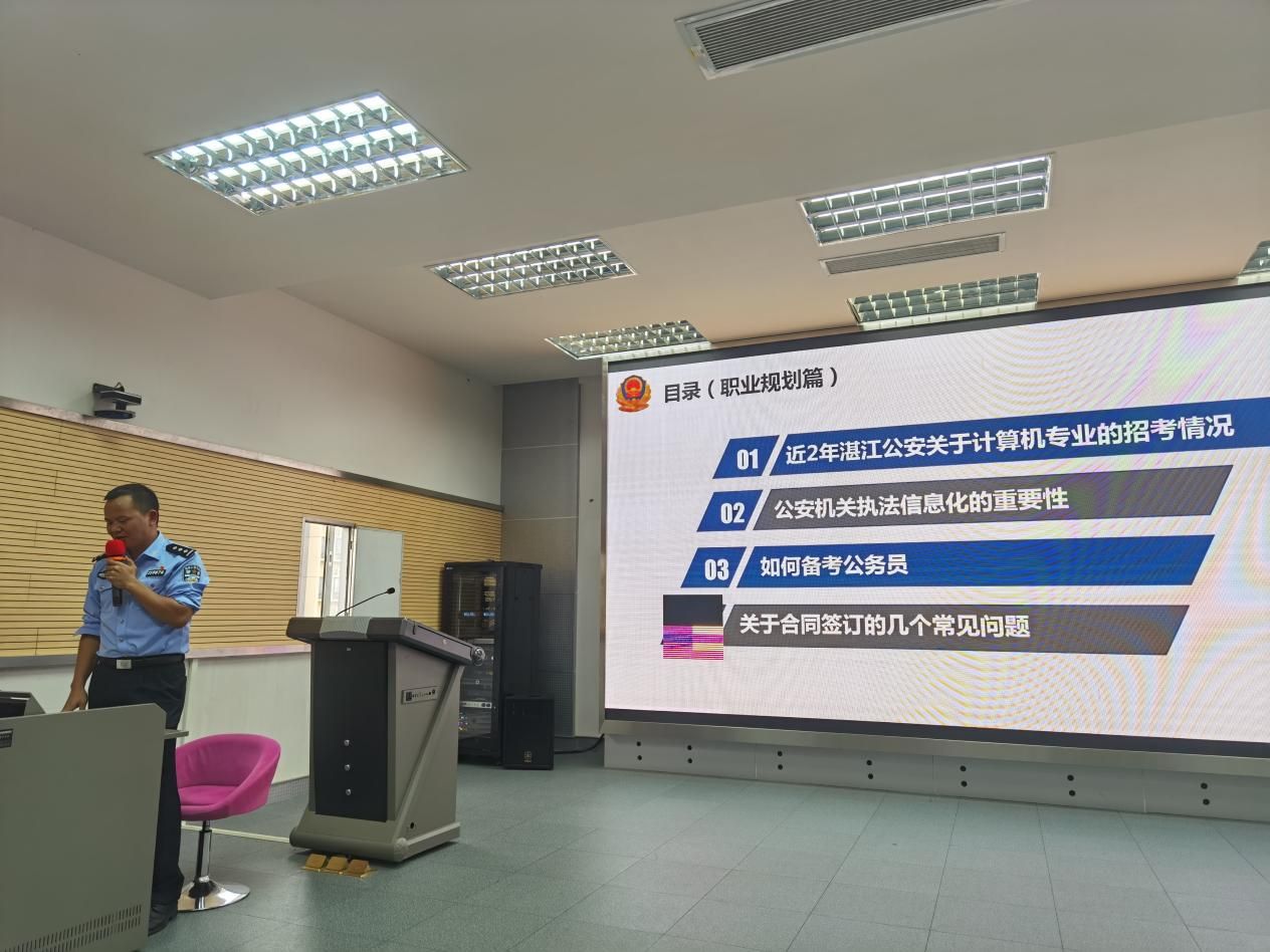 为切实推进学院就业工作高质量发展,帮助学生了解公务员考试政策和备考策略,11月29日下午,计算机与智能教育学院在雷阳楼802课室举办“计算机类大学生如何备考公安系统公务员”经验分享会。本次分享会特别邀请了湛江市公安局法制支队干警郑德恩,广州市公安局增城区分局干警、学院2020届校友朱梓通。本次会议由学院党委副书记陈明娟主持。