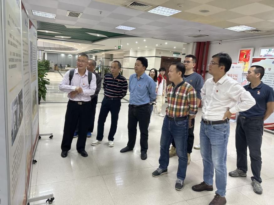 最后,法政学院党委理论学习中心组一行移步图书馆参观岭南师范学院红色校史人物展。大家先后参观了“书院精神高山仰止 红色血脉源远流长”、“雷州师范赓续薪火 英雄辈出彪炳史册”、“不忘初心接续奋斗 牢记使命铸魂育人”三个模块的展览内容,学习校史人物的革命事迹,感悟其革命精神。历史系教工党支部书记陈国威详细讲述了红色校史人物的革命事迹和重要影响,让大家重温了那段峥嵘岁月,谭平山、黄学增、黄其江等校史人物先辈们的先进事迹令在场的人员热血沸腾,倍受激励。大家纷纷表示,要在红色校史人物的故事中汲取前进的力量,继承和发扬校史人物先辈的革命精神和崇高品质,落实好立德树的根本任务。