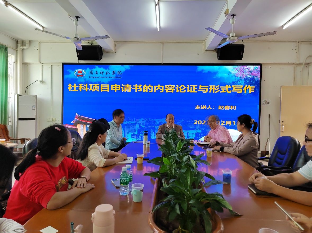 12月14日下午“珠江学者”特聘教授、全国高等院校现代汉语教学研究会副会长,广东省中国语言学会副会长、暨南大学文学院赵春利先生在我校文传学院会议室开展了题目为“社科项目申请书的内容论证与形式写作”的专题讲座。文学与传媒学院院长阎开振教授、文学与传媒学院副院长史习斌教授及文传学院部分教师参加了活动。讲座由阎开振院长主持。