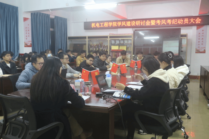12月18日晚,机电工程学院在教二401会议室召开学风建设研讨会暨考风考纪动员大会。学院党委副书记黄展,辅导员蔡文、庞可超、汤珍珍、陈柳平、吴梓健,学生助理班主任代表,21-23级班长、学习委员,学院各学生机构主要负责人,学生会学习部全体工作人员参加了本次会议。会议由汤珍珍主持。