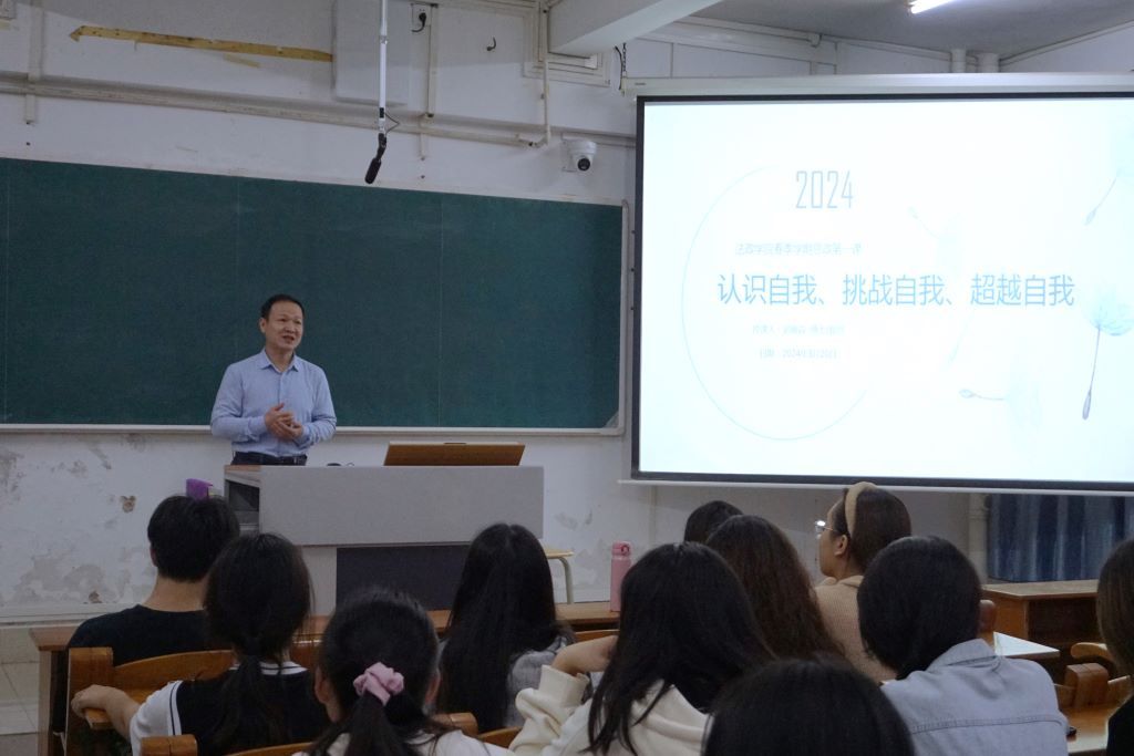 3月20日晚,为加强学院学风建设,鼓励法政学院学子把握时代机遇、踔厉奋发,法政学院院长刘鑫淼于弘雷楼503室面向2023级法学专业学生讲授“思政第一课”。