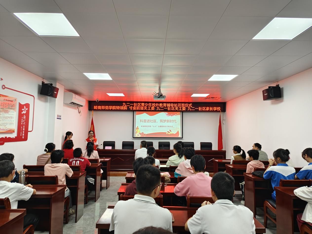 3月24日上午,为进一步弘扬科学家精神、传播科学思想、普及科学知识,进一步推进校地党建共建,加强上下协调联动,物理科学与技术学院与九二一社区联合举办了“科普进社区,筑梦新时代”青少年校外辅导班开班仪式。物理学院党委书记陈碧琼、赤坎区关工委常务副主任文志纯、寸金街道党工委书记洪武松及九二一社区党总支书记谢康凤等人出席了本次开班仪式。本次活动吸引了许多社区居民和学生前来参加。