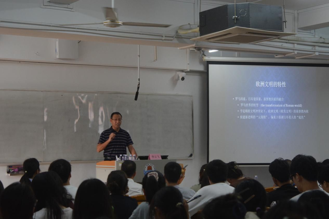讲座伊始,李云飞教授从中华文明五个突出特性的论述入手,向师生们展示出一副宏大的历史画卷,接着围绕罗马帝国转型下的欧洲众国并立竞逐而非延续帝国一体的学术前沿问题,探讨地理环境决定论、语言文化区隔论、欧亚地缘政治论、古典遗产制约论、基督教会制约论、国家构架模式论,全面考察中古时期欧洲国家(政治体)的类型和关系,认为德法分立是欧洲形成众国分立的关键因素。在微观研究层面,他系统梳理了自843年凡尔登协议至987年加佩王朝建立期间,德法王国内的继承安排以及两国间战争、协议等内容,认为德法分立格局形成是必然的,它对以后的德法关系及其欧洲乃至世界关系都产生深远影响。
