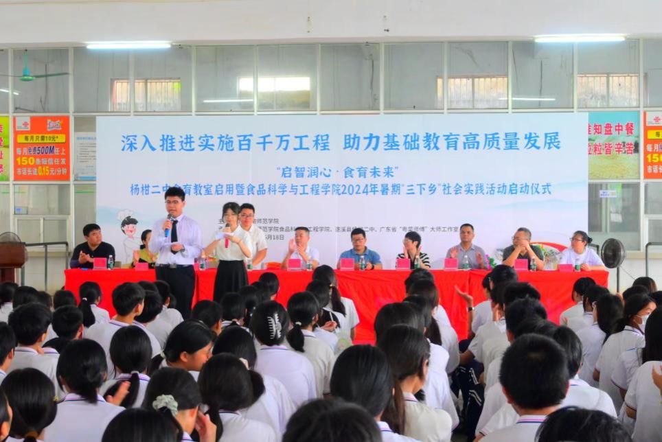 为深入推进实施百千万工程,助力基础教育高质量发展,食品科学与工程学院帮扶对接遂溪县杨柑二中,携手建立食育教室,丰富中学生课外活动,开展食育教育,6月18日上午,食品科学与工程学院领导带队赴杨柑二中,举办“启智润心·食育未来”食育教室启用暨食品科学与工程学院2024年暑期“三下乡”社会实践活动启动仪式。杨柑镇委书记蒋养、副镇长杨树森、杨柑二中校长周蝶和杨柑二中教师团队、岭南师范学院食品科学与工程学院党委书记邱飞、副书记刘淑芬、副院长黄亚芬、教务处实践科科长张晓波和教学发展与质量测评中心老师吴兰、食育教育团队李锐和张伍金老师、辅导员袁嘉渝和苏琳以及食育教育实践学生代表出席本次活动,本次活动由食育教育实践队队员牟景远、李晓河主持。