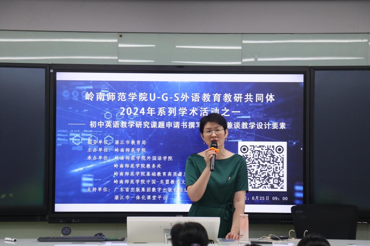 6月25日上午,外国语学院在教五A513室举办岭南师范学院U-G-S外语教育教研共同体2024年系列学术活动——初中英语教学研究课题申请书撰写策略:兼谈教学设计要素。本次讲座主讲嘉宾为华中科技大学徐锦芬教授,湛江市教育局教研室蔡艳莲副主任莅临会议并讲座指导。此外,参会人员还包括2024年粤东粤西粤北地区中小学教师全员轮训——初中英语骨干教师培训班全体学员、湛江市优秀教师代表、岭南师范学院外国语学院教师代表。会议借助湛江市一体化课堂平台开展同步线上直播,在线观看人数逾5000。