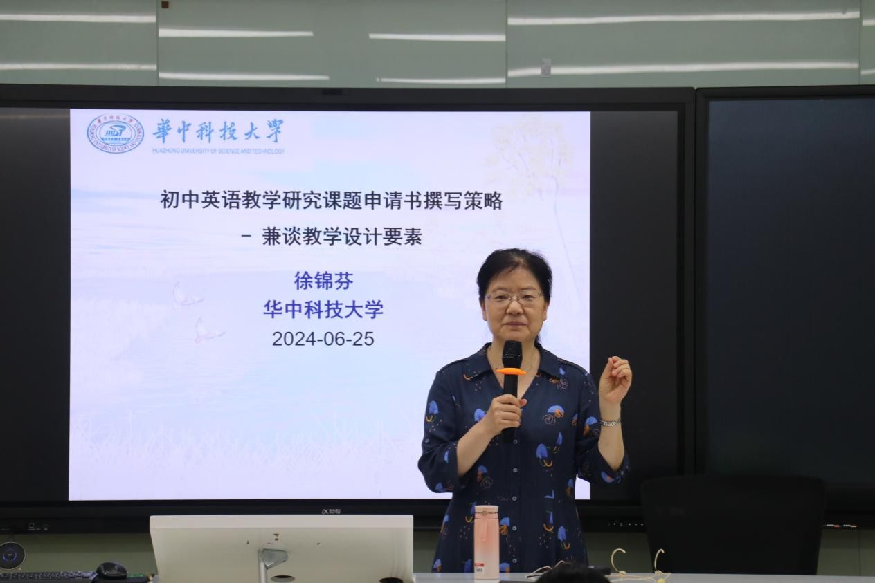会议伊始,外国语学院院长吴晓春教授致欢迎辞,对徐锦芬教授不远千里来到湛江为广大一线教师们做现场指导表示感谢,也对出席会议的其他嘉宾和教师表示由衷欢迎。接下来,徐锦芬教授以“初中英语教学研究课题申请书撰写策略:兼谈教学设计要素”为题,展开了一场深入浅出的精彩演讲。