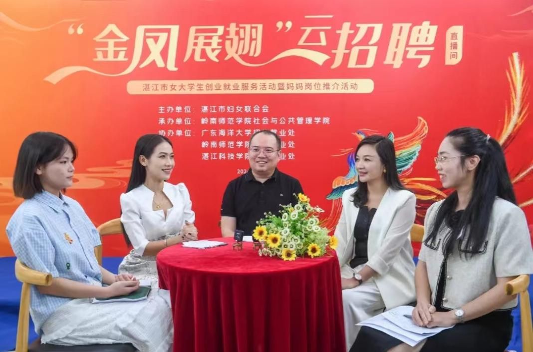 6月28日下午,由湛江市妇联主办,岭南师范学院社会与公共管理学院承办的“金凤展翅”云招聘直播活动在教五D栋405室成功开展,并在湛江女声微信视频号成功完播。此次活动以“湛江市女大学生创业就业服务活动暨妈妈岗位推介活动”为主题,旨在深入贯彻落实党的二十大精神,全力推进“巾帼就业创业促进行动”,为女性提供更多就业岗位和就业创业机会。