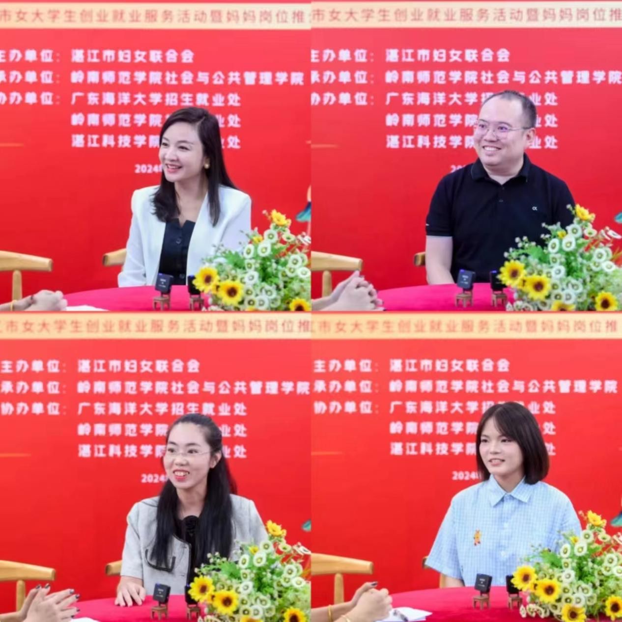 其中,湛江市谷丰食品生产有限公司董事长李小兰精准定位当前挑战与机遇并存的就业市场形势,为女大学生提供了极具价值的就业见解。人力资源管理专家王征博士结合本地经济发展数据,阐述了当前湛江市产业发展格局及对高素质人才的迫切需求和广阔就业前景,为广大学生指明方向。人力资源公司联合创始人陈思婷则结合自己多年的从业经验,为女大学生和宝妈们提供了一批优质岗位和“妈妈岗”,并促进她们与岗位的实质性配对。岭南师范学院社会与公共管理学院学生代表郑珏祎也分享了自身经历,展示了创业的可行性和积极影响,为女大学生提供了更多元化的职业选择思路。