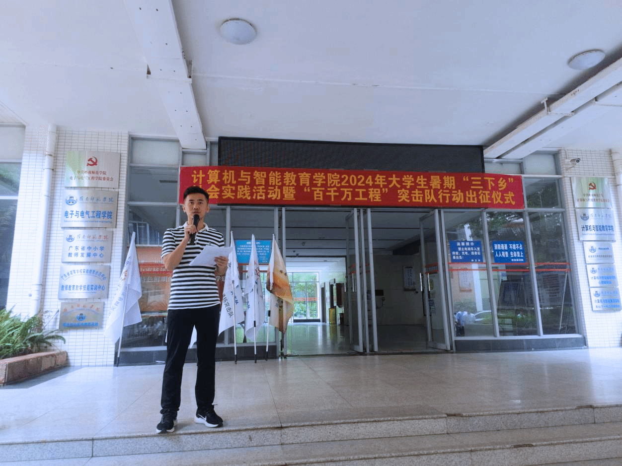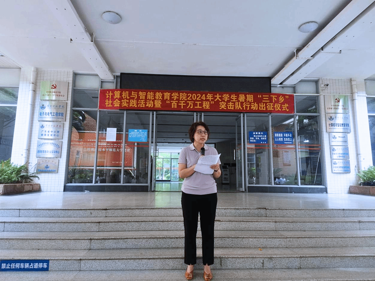 6月30日上午,计算机与智能教育学院举行了2024年大学生暑期“三下乡”社会实践活动暨“百千万工程”突击队行动出征仪式。学院党委副书记陈明娟、各指导老师以及各社会实践团队队员参加出征仪式。本次出征仪式由学院团委指导老师倪光睿主持。