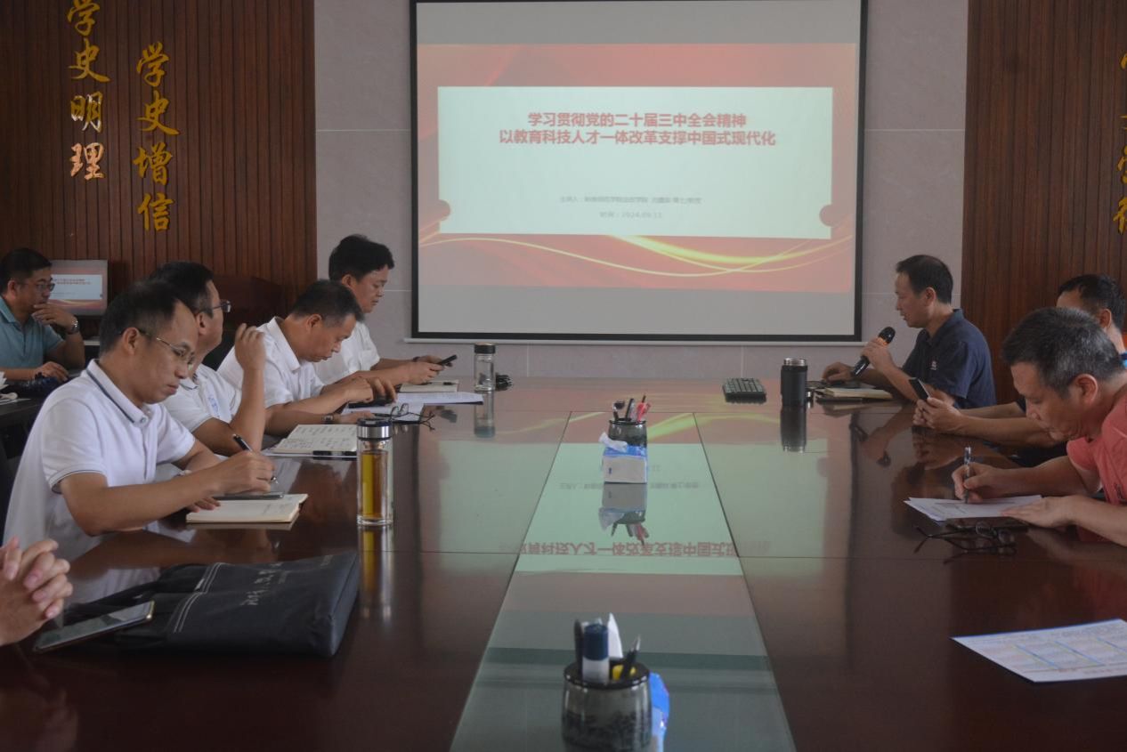 9月11日,法政学院党委理论学习中心组举行专题学习(扩大)会暨教职工政治理论学习会,学习贯彻党的二十届三中全会精神。法政学院党委书记李德深主持会议,院长刘鑫淼作专题学习辅导报告。