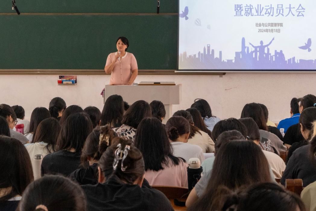 随后,社会与公共管理学院党委副书记邓蔚婵从提升自身硬实力、了解就业政策、充分利用学院资源、主动出击等四个方面展开动员。邓书记指出,一是毕业生必须不断强化自身的专业技能,全面提升综合实力。二是对行业保持敏感度,利用专业优势寻找相适应的岗位。三是了解国家基层就业政策,重点关注学院所提供的就业渠道和就业岗位。四是秉持认真的态度去对待实习,精心准备个人简历,在求职市场上主动出击。
