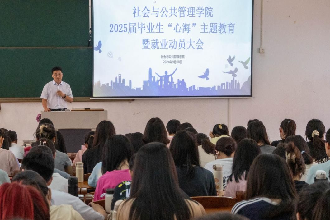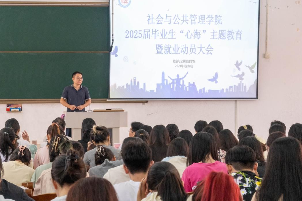 9月18日,社会与公共管理学院在第三教学楼611室召开2025届毕业生“心海”主题教育暨就业动员大会。学院全体领导班子成员,各毕业班班主任、毕业班辅导员以及2025届全体毕业生出席本次大会。大会由学院就业工作专职辅导员李从来老师主持。