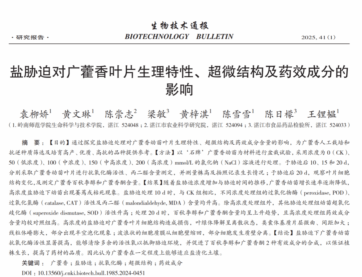 近日,生科院南药创新研究团队王锂韫教授、袁柳娇老师指导本科生黄文琳等同学在“中国科技期刊卓越行动计划梯队核心期刊”、“百种中国杰出学术期刊”《生物技术通报》上发表了题目为《盐胁迫对广藿香叶片生理特性、超微结构及药效成分的影响》的研究论文。