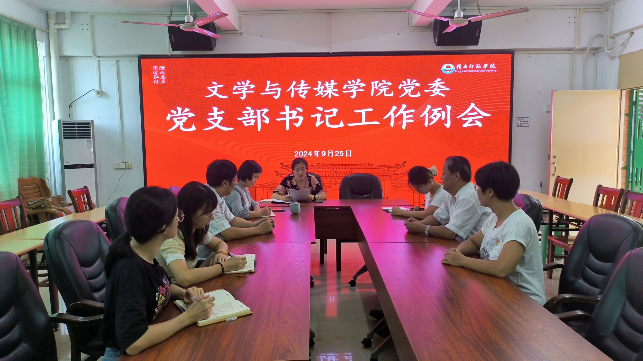 9月25日,文学与传媒学院党委召开秋季学期党支部书记工作例会,主题为学习贯彻党的二十届三中全会精神,汲取奋进力量,推动学院事业高质量发展。会议由学院党委书记陈凯珍主持。