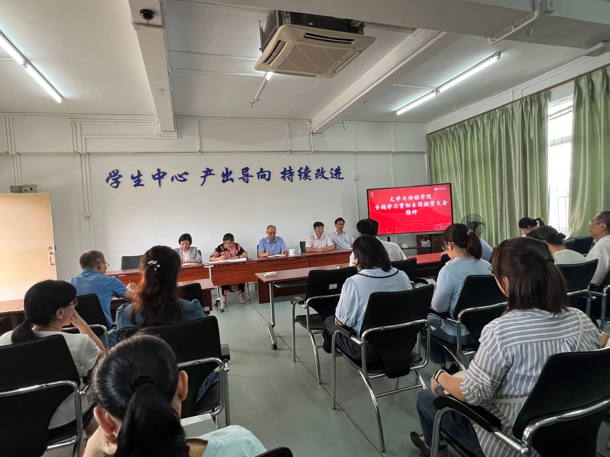 9月25日,文学与传媒学院组织全体教职工专题学习习近平总书记在全国教育大会上的重要讲话和全国教育大会精神,对学习宣传贯彻工作进行部署。会议由学院党委书记陈凯珍主持。