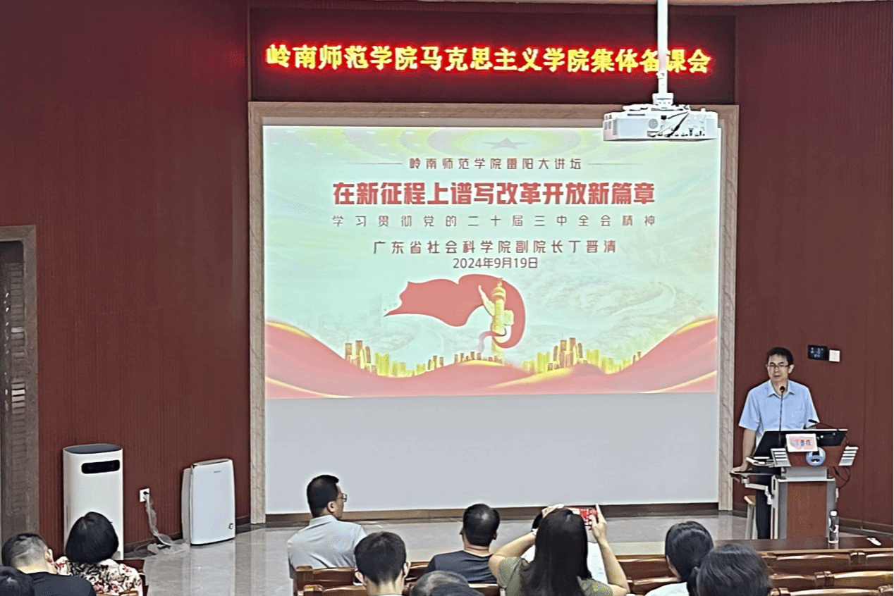 9月19日,广东省社会科学院党组成员、副院长丁晋清教授应邀到学校作党的二十届三中全会精神辅导报告,指导马克思主义学院教师开展集体备课,将党的二十届三中全会精神融入思政课教学。报告会在学校榕楼岭南讲堂举行,马克思主义学院领导班子以及全体思政课教师参加。报告会由马克思主义学院党总支书记邓倩文主持。