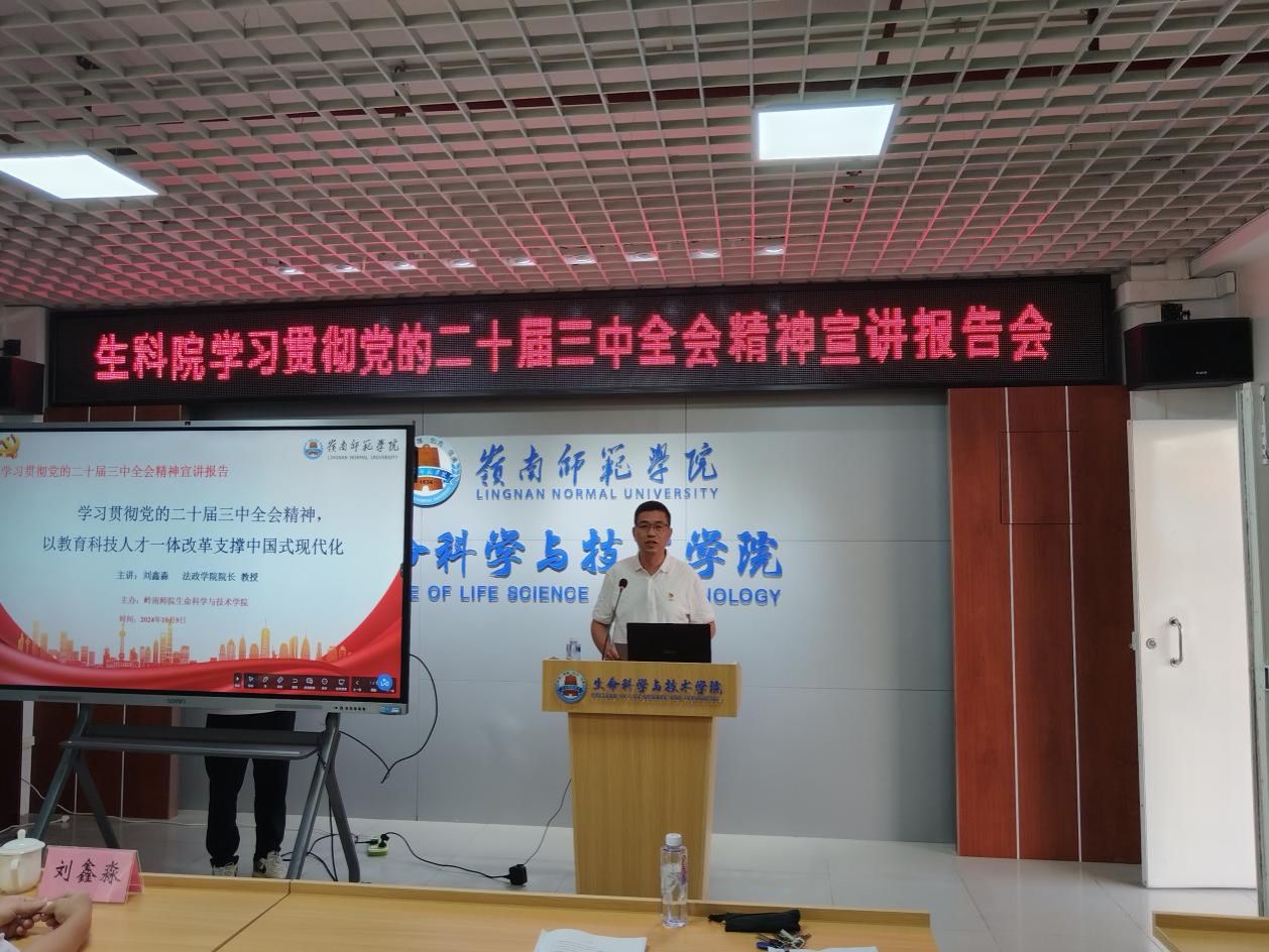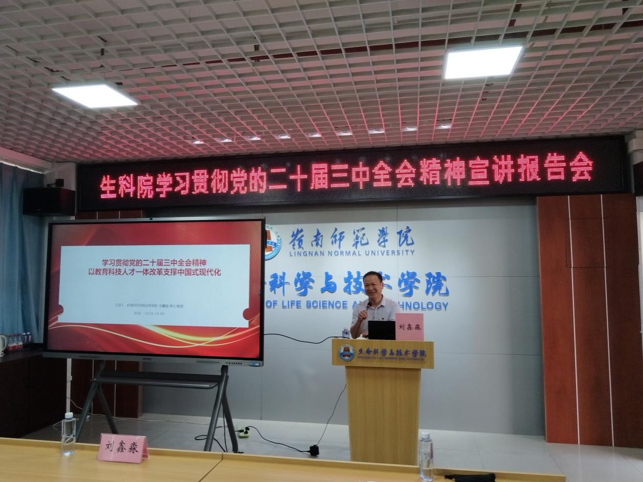 为深入学习党的二十届三中全会精神,扎实推进学习宣传贯彻工作,推动党的二十届三中全会精神落地生根、结出硕果,10月9日,生科院举办学习贯彻党的二十届三中全会精神宣讲报告会,邀请法政学院院长刘鑫淼教授以《学习贯彻党的二十届三中全会精神,以教育科技人才一体改革支撑中国式现代化》为题作专题宣讲。生科院领导班子、全体教师参加报告会。