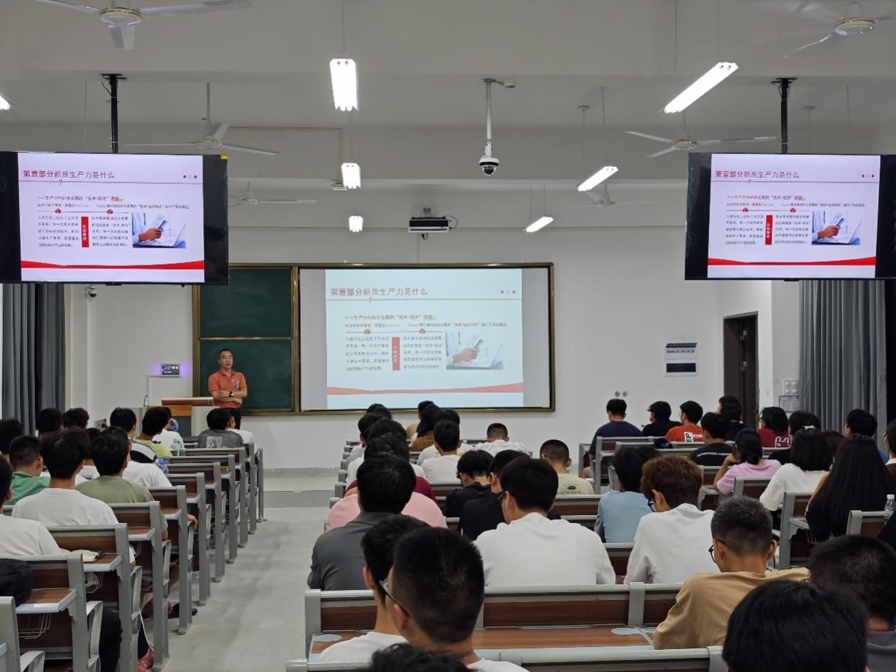 与此同时,在笃学楼201课室,杨俊杰以《新质生产力:计算机专业大学生的时代使命与发展机遇》为题,为2024级软件工程专业的新生们带来了一场精彩的思政课。他首先解释了新质生产力的概念,指出新质生产力是以信息技术为核心,融合大数据、人工智能、云计算等新技术,推动经济社会发展的新动力。