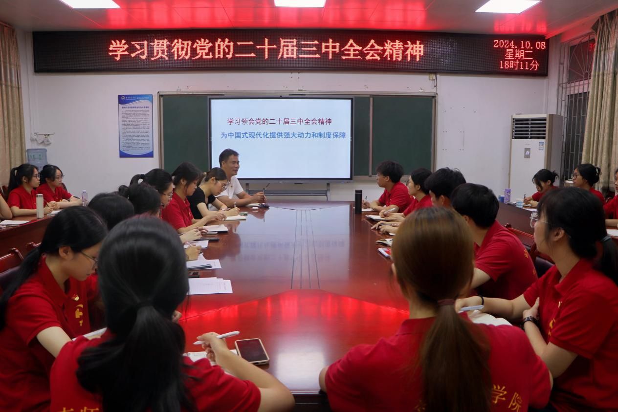 为深入学习贯彻党的二十届三中全会精神,引导数计学子将思想和行动统一到党的二十届三中全会精神上来,10月8日,数学与统计学院党委书记叶建仔于榕燕楼会议室开讲“思政第一课”,带领全体学生党员和发展对象深入学习领会党的二十届三中全会精神。会议由组织员张嫣主持。