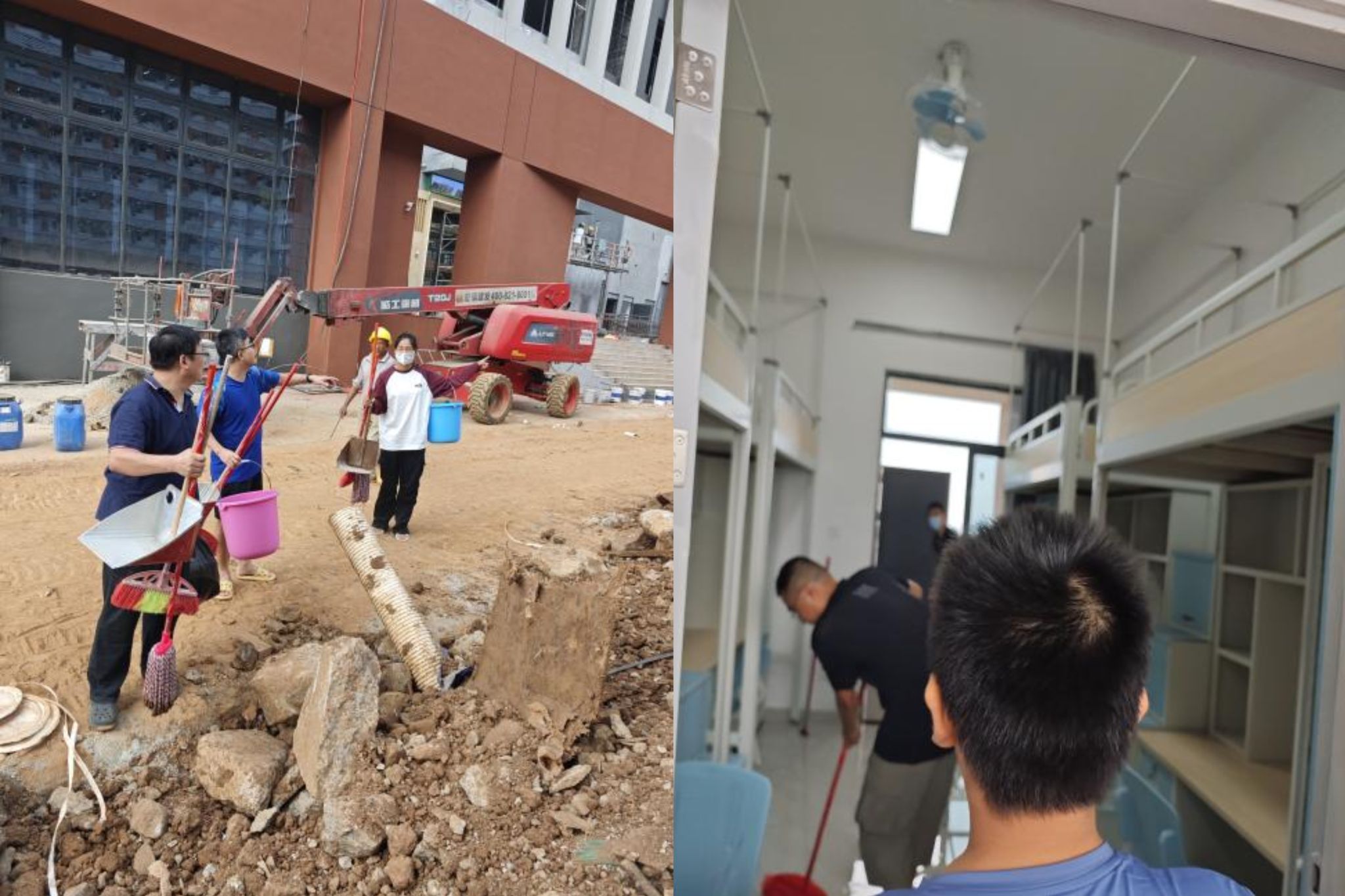 最初得知湖光校区征召志愿者后,刚结束学术交流活动归来的马琳教授主动请缨,第一时间投身校区工作一线——清洁、冲洗、检测……不怕苦、不怕累、不怕脏,舍区空地及楼层房间都可看到他“争分夺秒”的忙碌身影。在他奔赴校区前还听说清洁卫生工具不足,就个人主动提前采购及从家里多带一批,积极尽力帮助其他同事及工地工人想办法解决工具短缺等问题。他说,“志愿工作是很有意义的、很值得,只因校区需要,学校需要,更是新生入学需要。