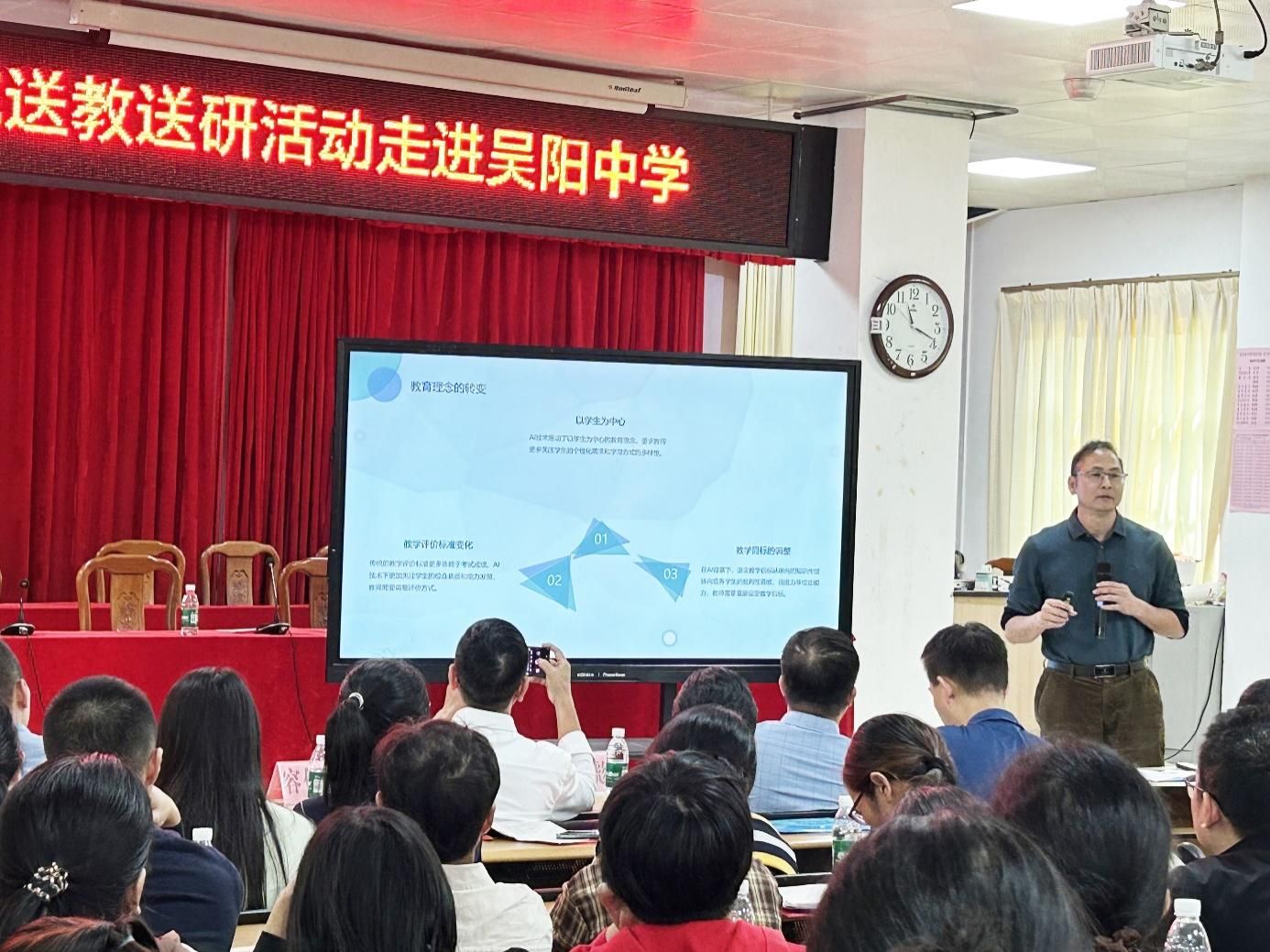 容伟文发表讲话,他表示此次教研活动是吴川市积极响应省委省政府关于“百县千镇万村高质量发展工程”的重要举措,也是推进吴川市基础教育创新发展的重要一步。通过岭南师范学院帮扶,期望为吴川市的中学教师搭建一个学习交流的平台,共同推动县中教学质量的提升。