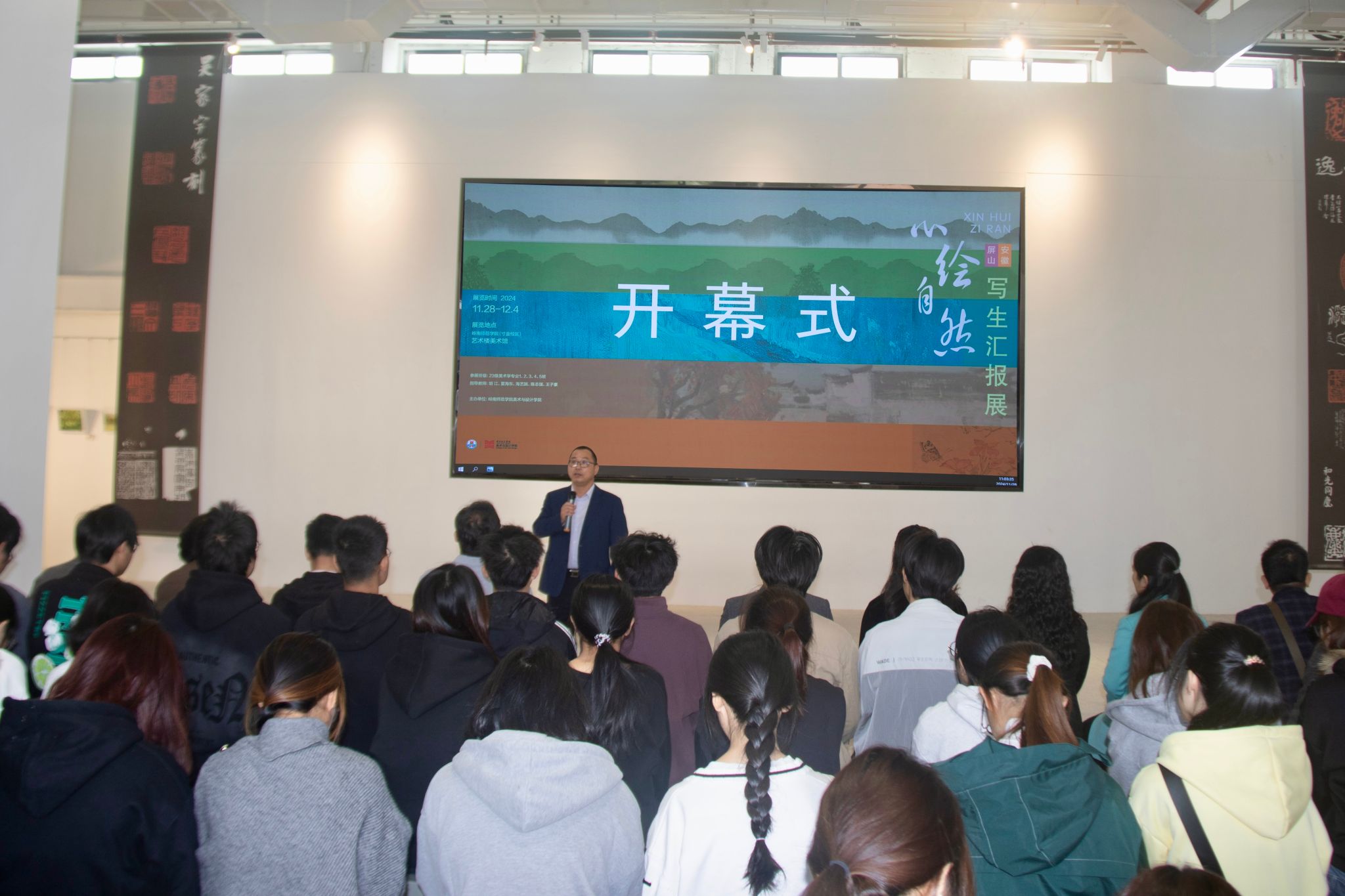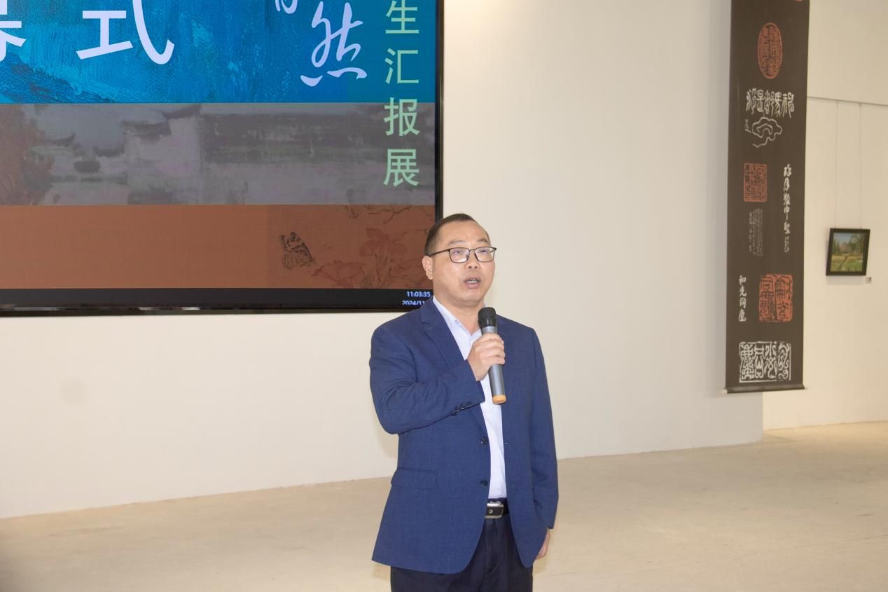 11月28日,美术与设计学院美术系举办“心绘自然--安徽屏山写生汇报展”开幕式。本次展览汇集了2023级美术学专业5个班级、175名学子的400余件美术写生作品,展示学生们在夏海东、海艺膑、陈志强、胡江、王子豪5位教师的指导下,在安徽省黄山市黟县屏山村进行的美术写生成果。湛江市美术家协会副主席徐海松、湛江市美术家协会副主席庄燕梅、湛江市美术家协会秘书长杨锦珍、美院院长乔志强、党委副书记王艳、副院长李吾铭、张健及美术系师生参加本次开幕式。本次开幕式由李吾铭主持。