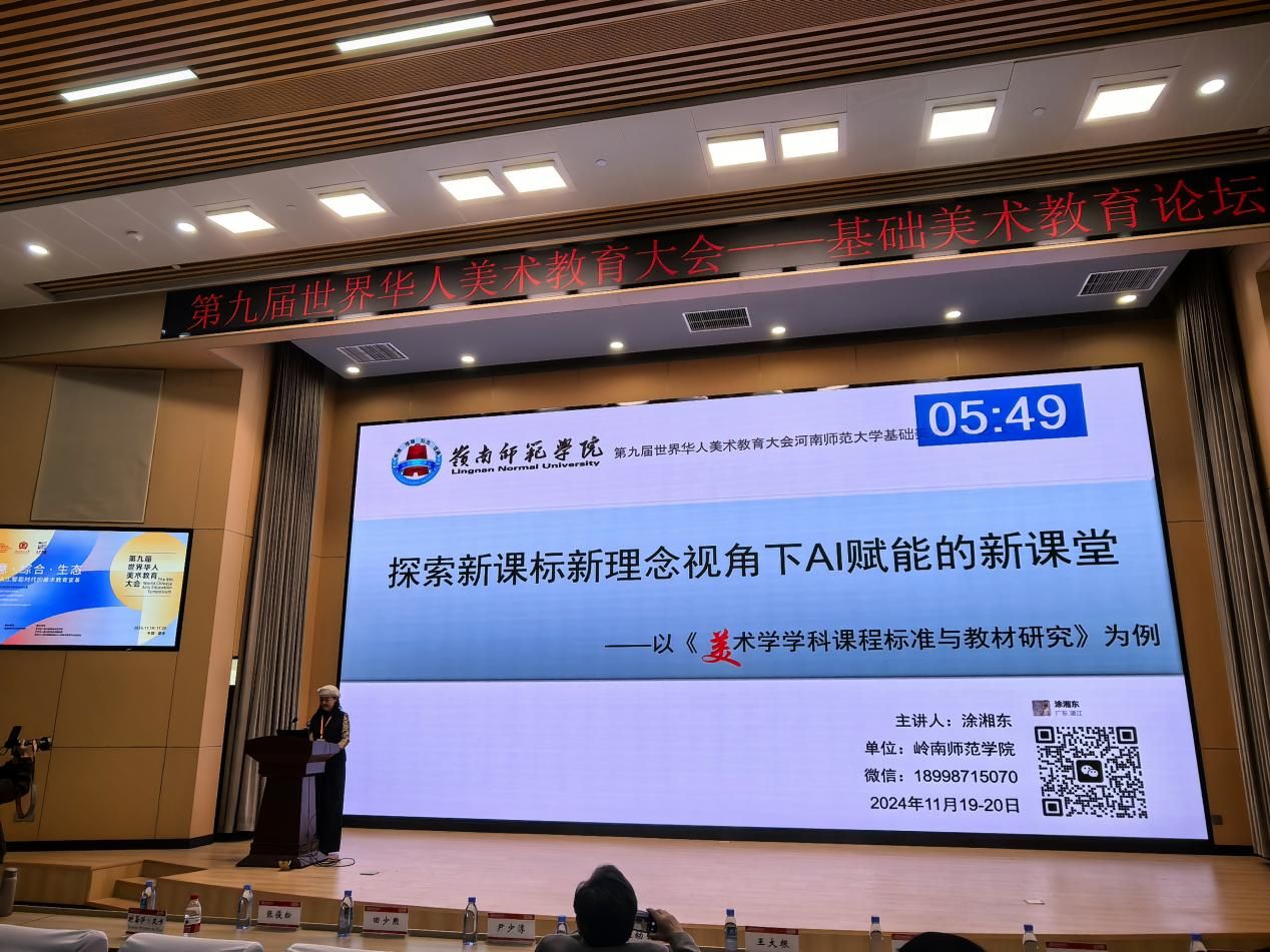 紧接着,11月19日至20日,基础美术教育论坛在河南师范大学召开。涂湘东再次出席,与来自中国、美国、加拿大、葡萄牙、澳大利亚、韩国等多国的专家学者共襄盛举。论坛的议题广泛而深入,涵盖了核心素养导向美术教学理论与国际比较研究、地方特色美术校本化课程开发与教学实践研究等。涂湘东在此次论坛上积极发言,分享了自己在美术教育领域的独到见解《探索新课标新理念视角下AI赋能的新课堂》并与参会者就人工智能时代美术教育的挑战与机遇进行了热烈讨论。