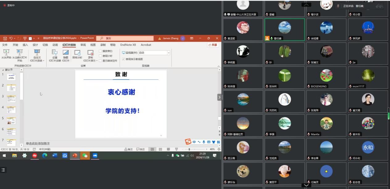 学校高度重视国家自然科学基金申报工作,为助力广大教师提升国家自然科学基金申报书撰写水平质量,11月28日,学校化学化工学院联合科学研究处,举办了一场“国家基金申报辅导”专题讲座之线上报告会。邀请中山大学电子与信息工程学院光电材料与技术国家重点实验室谢曦教授主讲。华南师范大学帮扶队成员、化学化工学院副院长董任峰主持报告会,化学化工学院、食品科学与工程学院、地理科学学院及科研处等单位70多位教师参加了报告会。