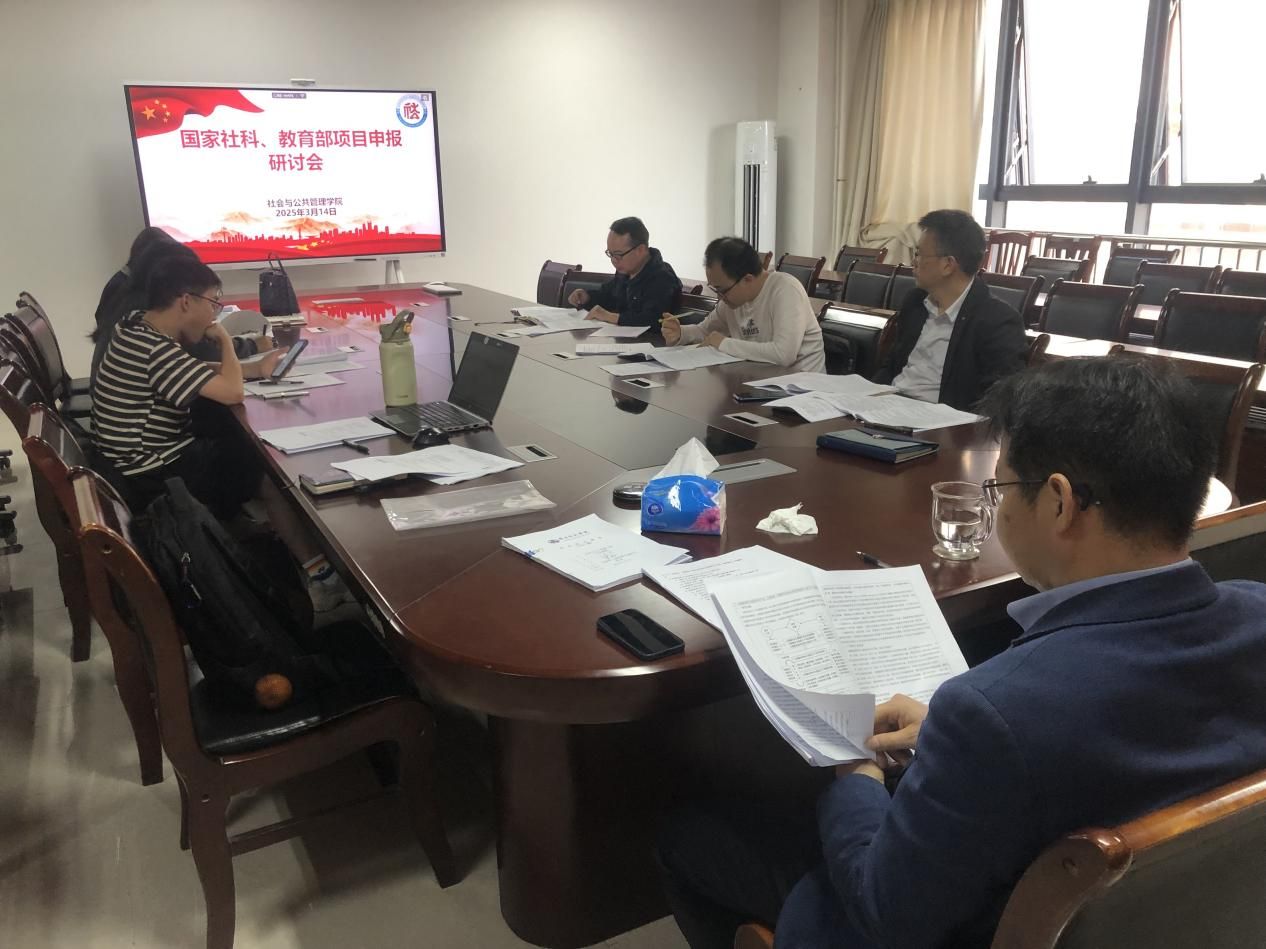 为推进高水平项目申报工作,社会与公共管理学院于3月14日在第五教学楼D303会议室召开国家社科与教育部项目的申报材料打磨、研讨会。社会与公共管理学院学术委员会成员、院长张勇、副院长黄剑、副院长徐凯赟、已获高水平项目的青年老师与今年申报项目的教师一起坦诚交流、积极探讨。