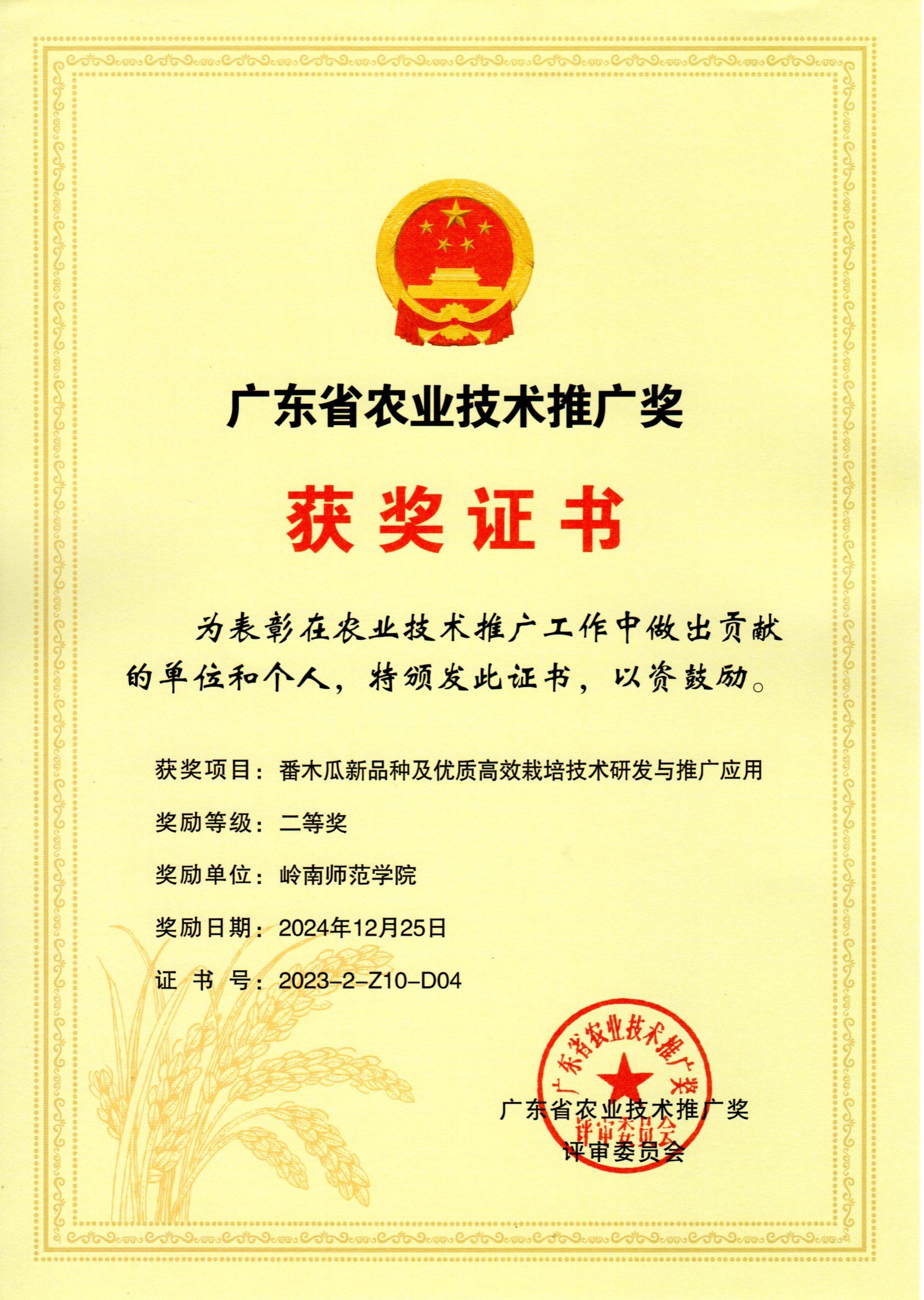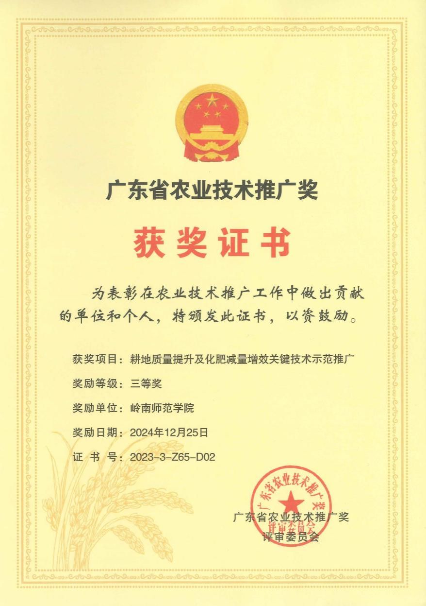 近日,广东省农业农村厅发布2023年度广东省农业技术推广奖评审结果,生命科学与技术学院刘锴栋参与的农业技术成果《番木瓜新品种及优质高效栽培技术研发与推广应用》荣获二等奖,李晓菲、莫雨杏老师参与的《耕地质量提升及化肥减量增效关键技术示范推广》成果荣获三等奖。