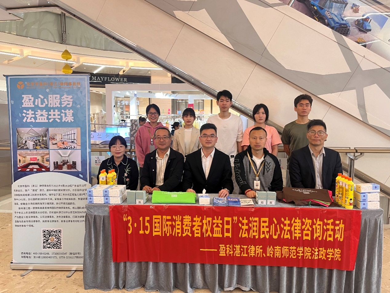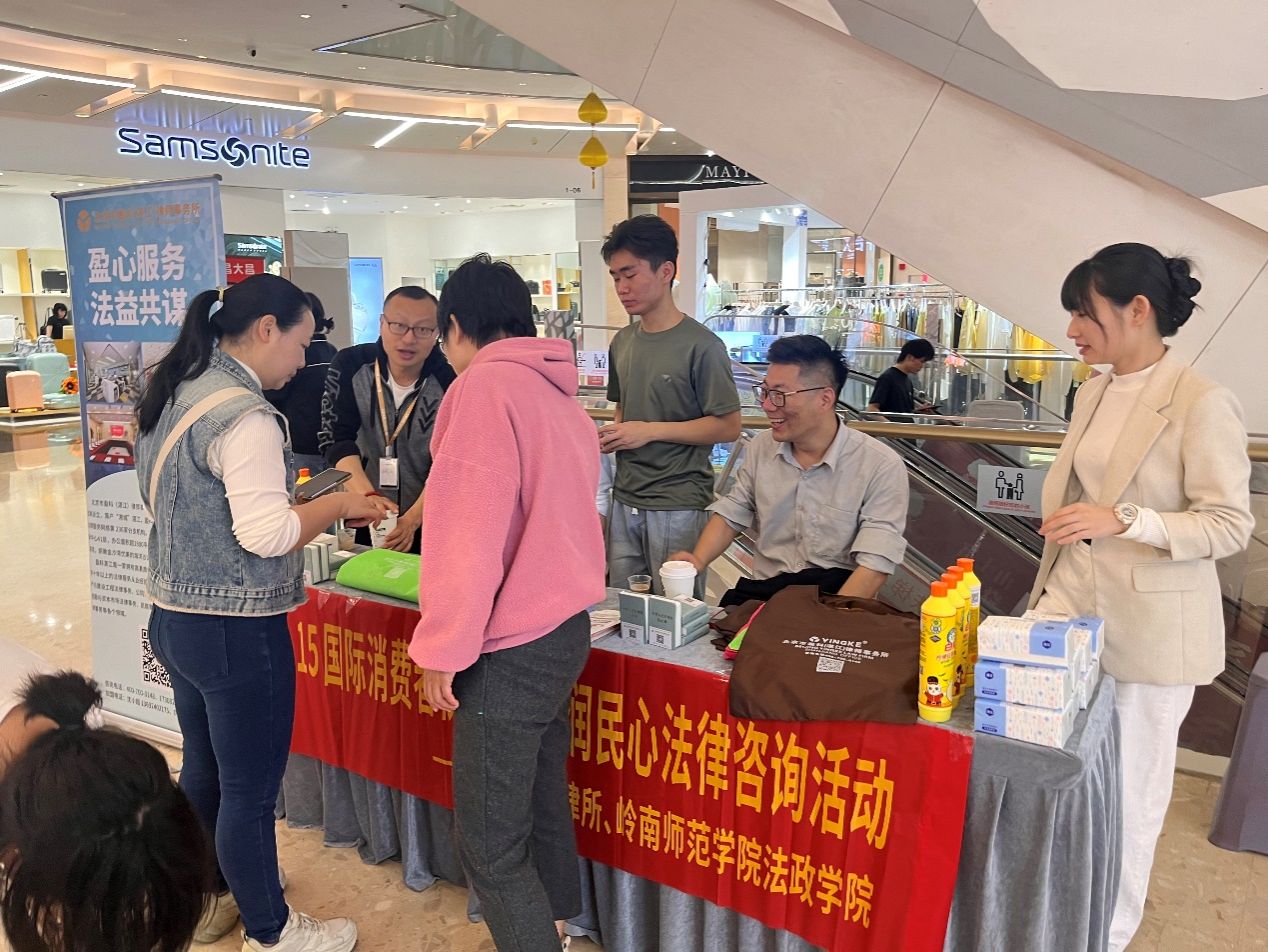 3月15日,岭南师范学院法政学院党委法学教工党支部联合北京市盈科(湛江)律师事务所党支部,在湛江市中心地标建筑万象金沙湾广场一楼开展“3·15国际消费者权益日法润民心法律咨询活动”。法学系支部书记庞峰博士、系主任耿志强博士、支部委员朱帅博士与北京盈科(湛江)律所黄悦峰书记、律所管委会副主任梁南波律师等参与活动