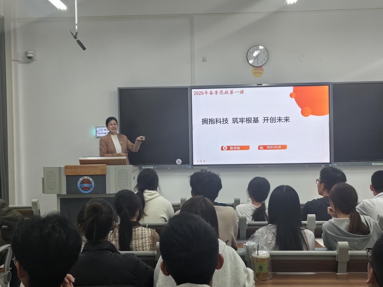 3月20日,学校物理科学与技术学院党委书记陈碧琼在湖光校区励学楼306教室,为物理科学与技术学院2024级学生讲授主题为“拥抱科技 筑牢根基 开创未来”的2025年春季学期“思政第一课”。
