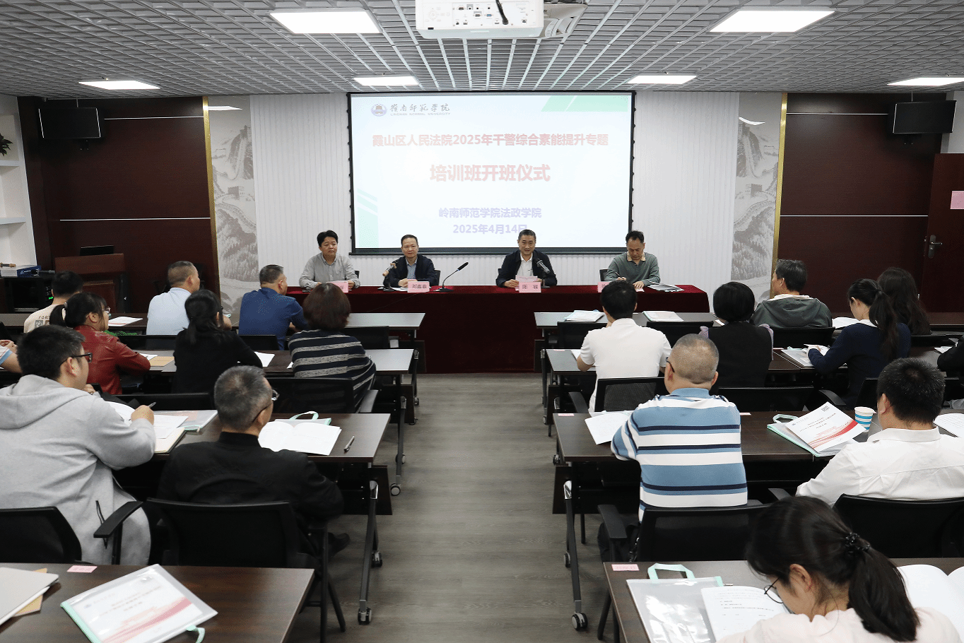 为了充分发挥高校社会服务功能,加强校地合作,推动学校法学专业高质量发展。4月14日上午,湛江市霞山区人民法院2025年干警综合素能提升专题培训班在学校开班。霞山区人民法院党组书记、院长陈福、法政学院党委书记李德深、院长刘鑫淼,以及霞山区人民法院干警30多人参加。开班仪式由李德深主持。