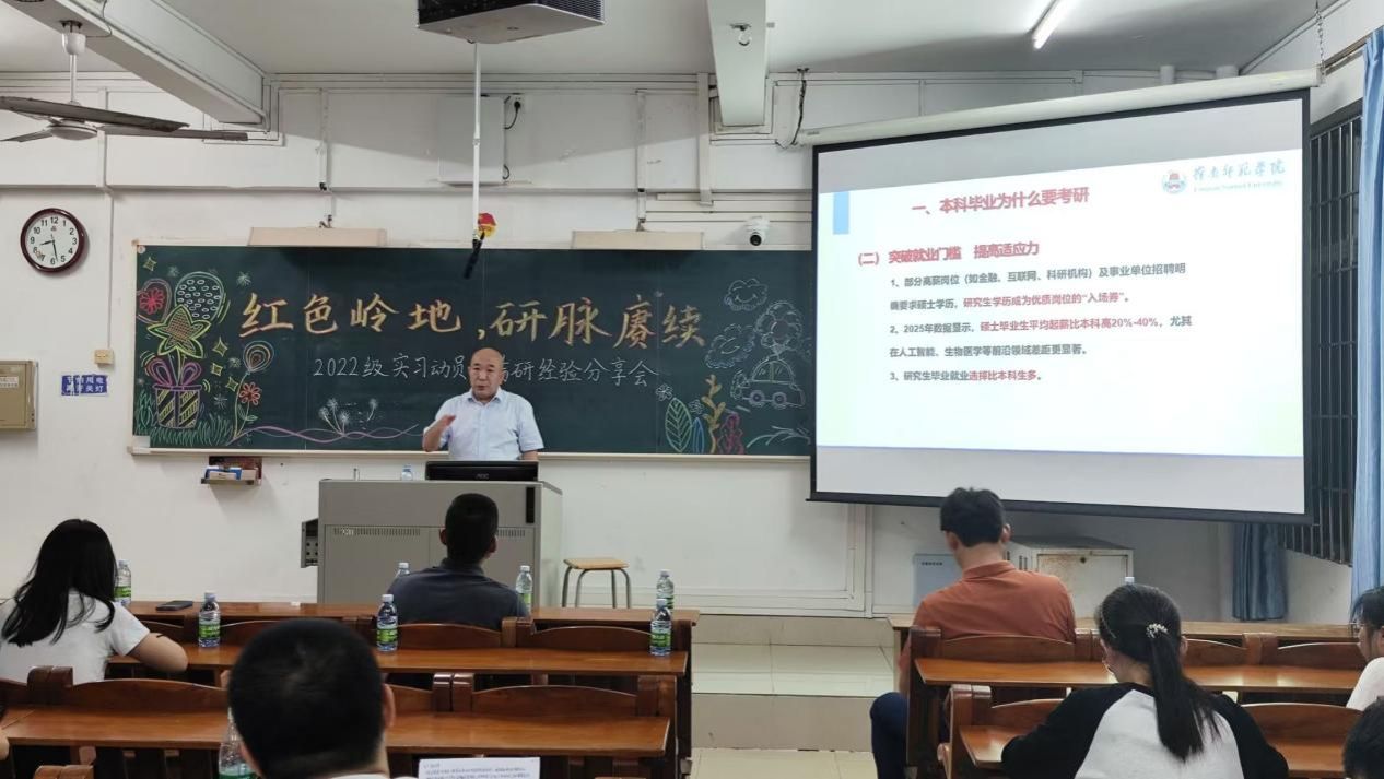 为统筹推进2022级学生毕业实习与考研备考工作,地理科学学院于4月26日在第三教学楼203教室召开“红色岭地 研脉赓续”2022级实习动员暨考研经验分享会。地理科学学院院长薛书文教授、党委副书记王雄艺、副院长尚志海教授、2022级辅导员梁津铭老师及全体2022级学生参会,特邀2021级优秀考研学子罗柳、林樱分享备考经验,会议由辅导员潘妃妹老师主持。