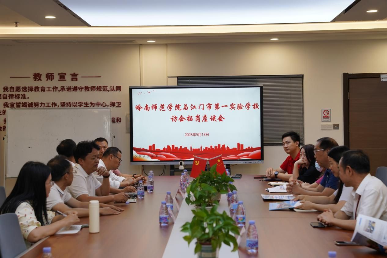 在江门市第一实验学校,该校总校长王协民、初中部校长刘惠玲等校领导热情接待了法政学院一行,带领大家参观了校园、办学设施和办学成果展览,并召开了访企拓岗暨校友座谈会。座谈会上,李德深详细介绍了学校和法政学院的办学最新情况,希望与江门市第一实验学校在教育实习、毕业生就业和教师专业发展等方面建立密切的合作关系,推动双方教育事业高质量发展。王协民对法政学院一行表示热烈欢迎,指出在江门市第一实验学校工作的我校校友占该校专业教师的11%,他们以突出的能力、过硬的业绩在各个岗位为江门市第一实验学校发展做出了重要贡献,希望进一步加强与岭南师范学院的合作,期待有更多岭南师范学院的优秀毕业生加入学校。与会的校友们也纷纷表示,感谢母校的培养,将在江门市第一实验学校不同工作岗位上以优异业绩为母校添加光彩。