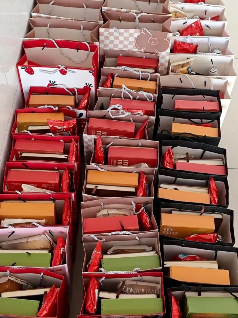慰问品“升学深造大礼包”中,有学院专门定制的考研笔记本,里面有2024届和2025届考研光荣榜,用榜样力量鼓舞今年的考研生;还有学院科研产品——热带水果果干,每一口都饱含着阳光的味道和学院满满的关爱,酸酸甜甜,为同学们在紧张的备考中带来味蕾的享受和身心的放松。其他精心准备的小吃也充满巧思与寓意:沙琪玛,愿同学们备考之路“顺顺当当”,每一步都扎实稳健,朝着目标稳步前进;巧克力派,希望大家能“派”除万难,无论遇到何种挑战都能从容应对、顺利攻克;娃哈哈AD钙奶,祝福同学们“活力满满笑哈哈”,以充沛精力投入复习,保持最佳备考状态;QQ糖,则寓意同学们“Q”掉难题 ,轻松应对备考中的挑战。