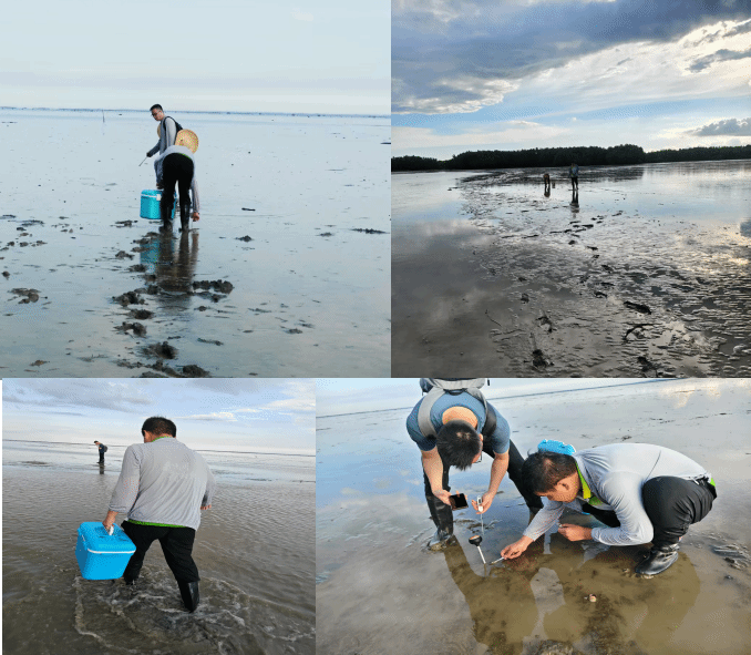 生科院教工第三党支部迅速行动起来,围绕中华鲎人工繁育项目,积极开展科研攻关和技术服务,为合作项目的顺利实施提供了有力支撑。博士袁吉贵作为该支部的优秀党员,以身作则,全身心投入到研究工作中。他率领调研小队,于7月26日奔赴雷州市北家村中华鲎原生滩涂开展实地调查,深入了解中华鲎在自然环境中的生长和繁殖习性。8月5日,赴博康公司中华鲎人工繁育基地开展调查活动,重点研究中华鲎在养殖池塘中自然产卵和受精的“疑难杂症”,为技术升级提供了宝贵的第一手资料。