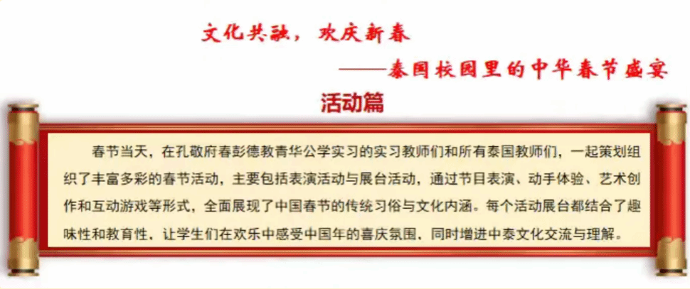 2024年12月,恰逢岭南师范学院师范教育120周年庆。“祝岭南师范学院越办越好!”的声音响彻湄南河畔。身处泰国的汉教学子们将对岭师的感恩融入到中文教学实践中,带着岭师的百年底蕴与教育情怀传递到异国他乡,和泰国学生共同录制了祝福视频。这支视频一经发布便登上《岭师青年》公众号,收获 1w+播放量。