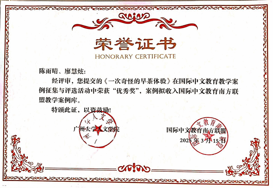 在国际中文教育教学案例征集活动中,陈雨晴、廖慧炫同学在陆华老师的指导下,凭借作品《一次神奇的早茶体验》荣获优秀奖。她们将中国传统早茶文化融入中文教学,以新颖的教学方式和生动的课堂设计,让泰国学生在体验中学习中文,感受中国文化的魅力。这份荣誉,是对她们创新教学实践的肯定,也为国际中文教育提供了新的思路与方向。