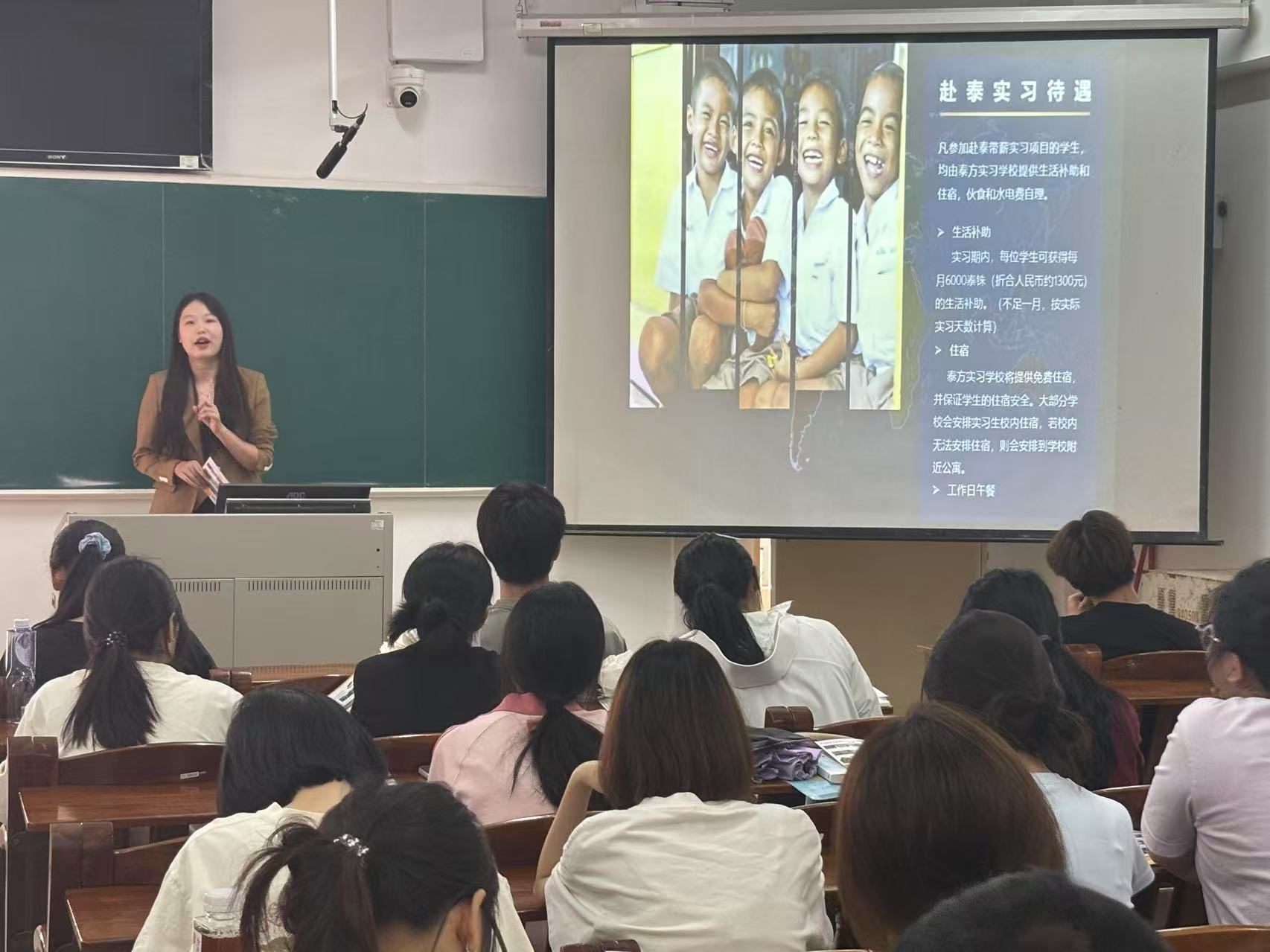 然后是由泰国盛唐文化教育集团的黄绍娜老师作项目讲解。背景介绍板块,黄绍娜老师提到“泰国中小学中文教师缺口持续扩大,自2006年项目启动以来,每年向泰国输送300余名实习教师,覆盖幼儿园至职业院校教学岗位,为不同专业背景的学生提供多元选择方向。”随后她又详细地介绍项目报名流程、实习待遇以及保障体系等具体情况。在答疑环节中,针对学生关心的“非汉语国际教育专业能否申请”“泰语零基础如何应对”等问题,黄绍娜老师耐心地逐一解答。在宣讲会尾声,黄绍娜老师播放了两段往届实习生赴泰实习的工作生活片段—课堂上,文传学子将理论融入实践,用新思路、新方法传播中国文化;生活中,无论是烈日当空时还是夕阳落日下,尽是相处时的欢声笑语,洋溢着的是跨国情谊的真切。视频播放完毕后,教室里响起热烈的掌声,讨论声此起彼伏。