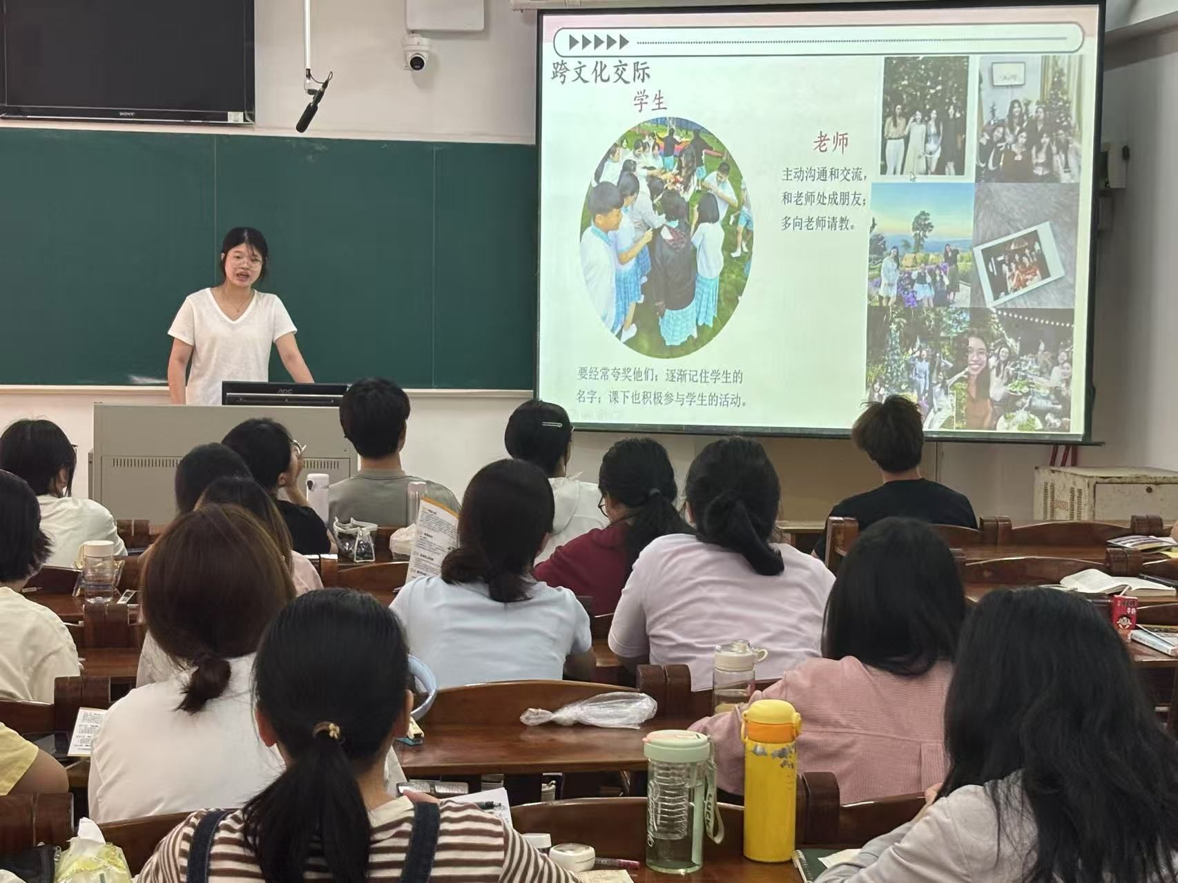 首先由优秀实习生代表黄雨桐进行经验分享,她分享的主题是“课堂内外的双向成长”。她回忆起自己初抵泰国时的复杂心情,既有对新旅途的激动,也有对未来挑战的不安。接着,她从教学、生活、文化体验方面向学生们娓娓道来,她谈到自己与泰国学生相处的欢乐时光;与当地教师游玩的美好回忆;与泰国文化邂逅的特别瞬间。她还分享了自己周末探索泰国夜市,参与当地节日等异国见闻。青春的成长需要勇敢,通过实习过程中对泰国文化和当地生活的不断深入了解,她认为自己的实习之旅是丰满而有意义的。结束时,黄雨桐表示“在泰国的每一个瞬间都让她明白教育不仅是知识传递,更是心与心的连接。中国人民的友善和温情会通过更多的对外汉语教师更广泛地传播出去。”