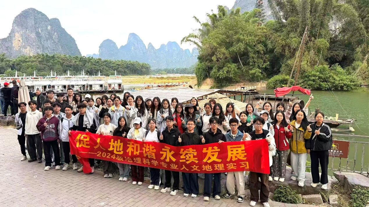 2024级地理科学3班走进兴坪古镇,在漓江山水间开展了一场别开生面的红色教育。同学们在有着百年历史的古戏台前,聆听当地老人讲述“兴坪战时青年服务队”的抗战故事;在碧波荡漾的漓江畔,开展“红歌快闪”活动,将《歌唱祖国》的嘹亮歌声传遍山水之间。