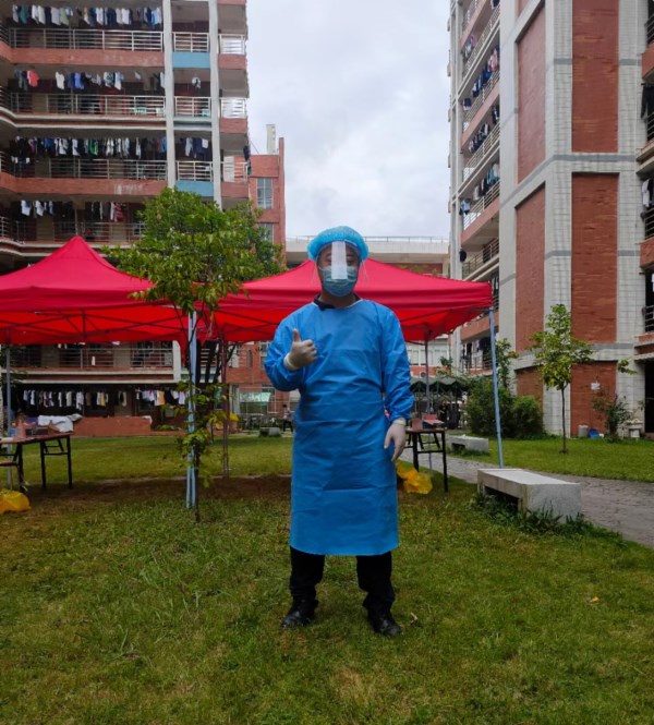 一身防护服、口罩,一天的忙碌足以疲惫不堪。广东省注册志愿者、学院组织员张玲副处长连续两天坚守在核酸检测现场当“大白”。她说:“我是一名党员,无论哪种身份都指引着我主动付出,听党指挥,用行动践行初心使命”。