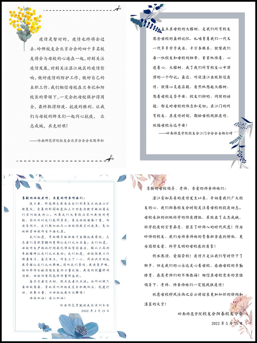 一封封承载着校友赤子之情的“家书”,架起了一座母校和校友同心抗疫的连心桥。校友无论身在何处,始终心系母校,充分体现了校友对母校的深厚情谊和责任担当。一份份情谊汇聚成了同舟共济、守望相助的磅礴力量,为母校师生拉起了一道道抵御病毒的温暖防线。