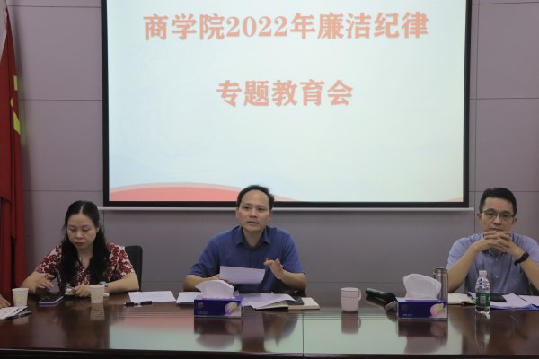 6月15日下午,商学院于燕雷楼309会议室开展廉洁纪律暨师德师风专题教育会。会议由商学院党委书记何等浩主持。