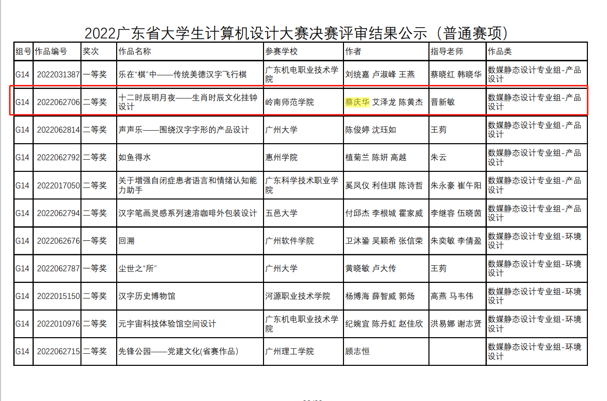 近日,2022年(第15届)中国大学生计算机设计大赛省赛已公示结果,机电工程学院工业设计专业学子蔡庆华、艾泽龙、陈黄杰的作品《十二时辰明月夜——生肖时辰文化挂钟设计》,梁家柱、莫美雪的《笔画万千》分别获得省级二等奖。