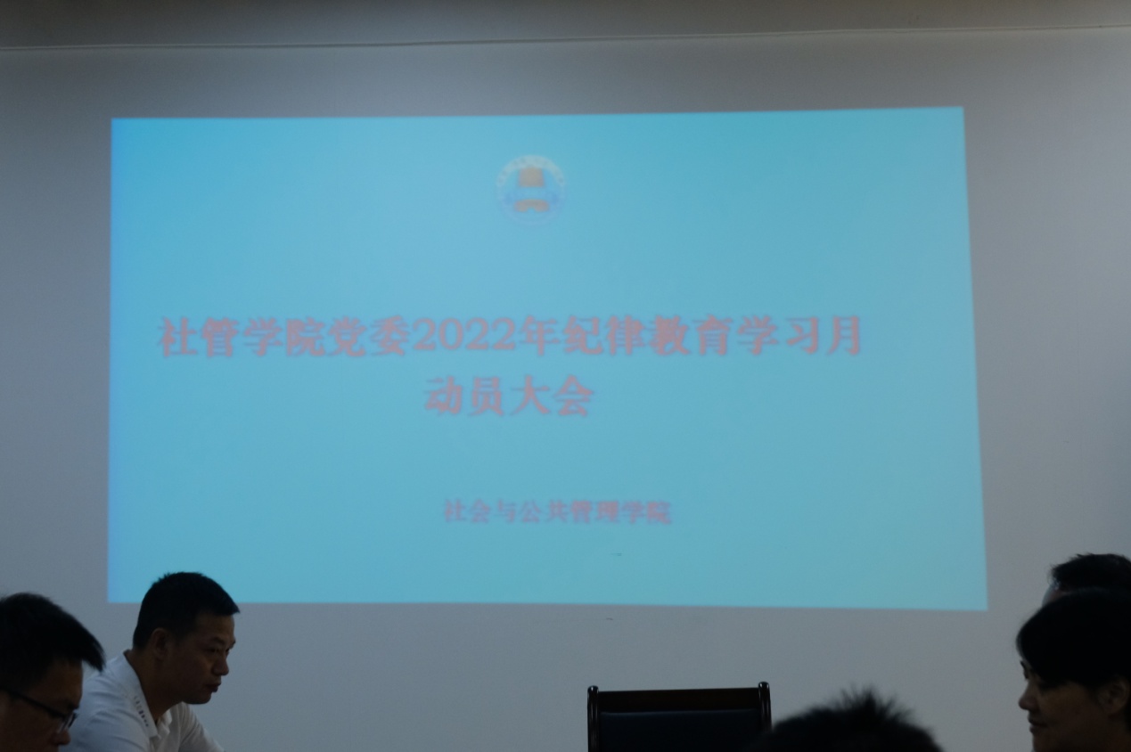 为深入学习贯彻党的十九届六中全会精神和习近平总书记在十九届中央纪委六次全会上的重要讲话精神,贯彻落实学校纪律教育学习月活动要求,9月7日下午,社会与公共管理学院党委在教五D303-2室举行2022年纪律教育学习月动员会。会议由学院党委书记冯亮如主持,学院全体教职工出席本次会议。