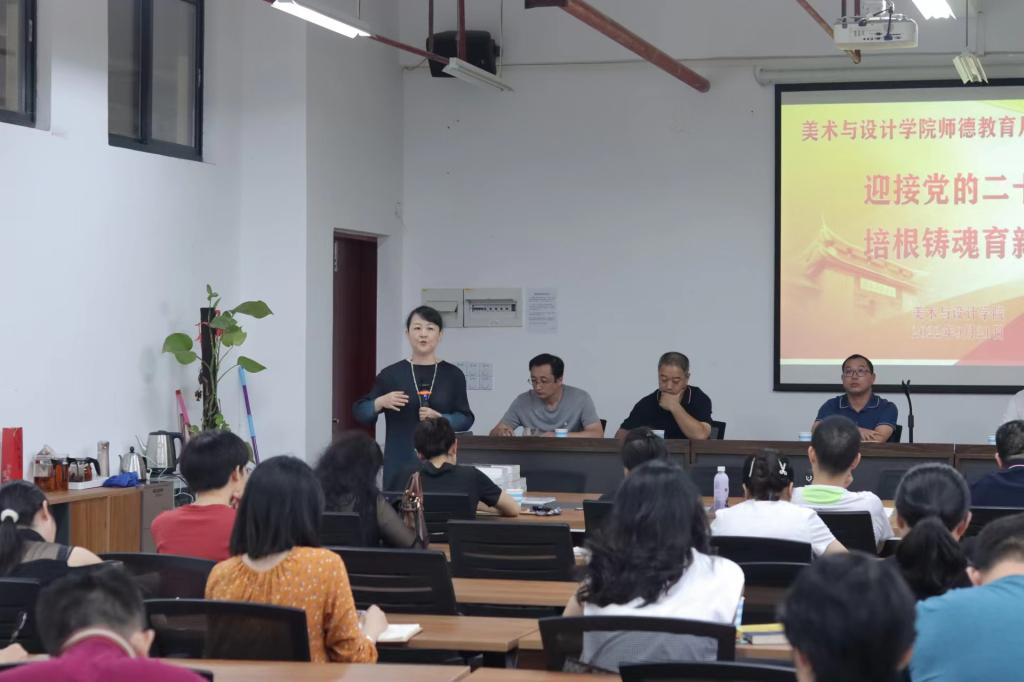 9月21日下午,美术与设计学院召开主题为“迎接党的二十大,培根铸魂育新人”的师德建设主题教育月推进工作暨师德巡讲活动,学习习近平总书记关于师德建设的重要论述,传达学校师德教育月活动文件精神,开展师德巡讲活动。